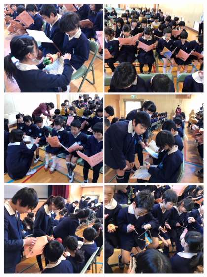 今日は音楽集会!「赤鼻のトナカイ」「ジングルベル」「きよしこの夜」「あわてんぼうのサンタクロース」子どもたちが大好きなクリスマスソングを歌いました。しかも歌うだけではありません!6年生のお兄さん・お姉さんたちに教えてもらい、トライアングルやカスタネット、ウッドブロック、ギロなど、いろいろな楽器も演奏しました。とっても楽しい集会になりました。