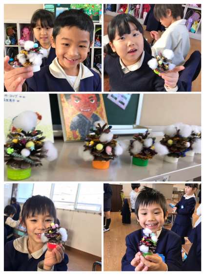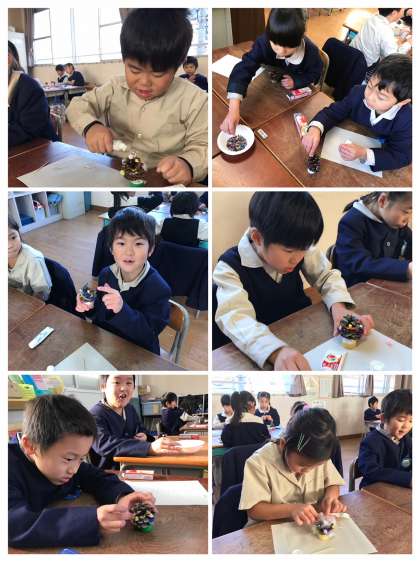 今学期最後の図画工作科!松ぼっくりを使ってクリスマスツリーを作りました!爪楊枝の先にボンドをつけて、細かい飾りをひとつひとつ付けていきました。その表情は真剣そのもの!そして、ひとつ付く度にホッと笑顔♪「これ、玄関に飾ろう!」「そしたらサンタさんが来たときに見えるやんな!」とっても可愛いツリーが出来上がりました!