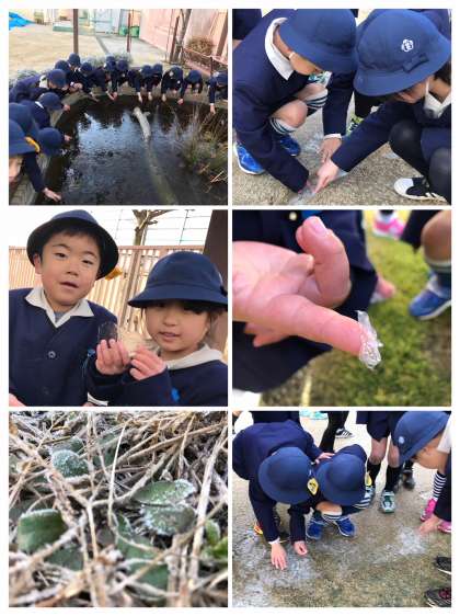 今日の生活科は「冬を見つけよう!」をめあてに学習しました。校庭に出てみると、芝生にはうっすら霜が・・・。水たまりも凍っています。ビオトープにも氷がはっています!子どもたちは「わぁ!芝生パリパリやぁ!」「氷、つめたっ!」「ビオトープの氷、でかっ!」「カメの池も凍ってるでー!」目をキラキラさせながら、冬をたくさん見つけることができました。