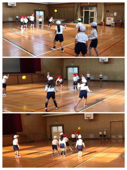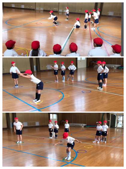 体育の時間。昨日1組さんと合同で行った「室内オリンピック」の楽しさが忘れられない子どもたち、「1つだけでいいから、オリンピックの競技がしたい!」という要望に急遽こたえることに。輪っかを投げて、その輪っかめがけてジャンプ!それを三回繰り返します。1番遠くまで進めたチームの勝ち!競技に挑むチームだけでなく、応援にも力が入ります。その後は、いつものボール投げ練習をして、いざドッジボールの試合!今日も体を目一杯動かした1時間になりました。