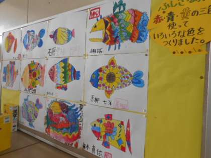 4年生の後ろの壁が子どもたちが描いた魚で賑わっており、まるで水族館です!