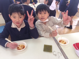 焼きあがったら家庭科室に移動して、お醤油、砂糖をかけて完成です。