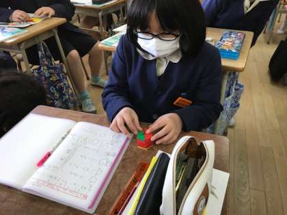 一部、5年生の内容が板書されています。異分母分数によるたし算は、5年生の内容ですが、あくまで、パターンブロックを組み合わせて1を作っている場面の中でたまたま出てきたものですので、決して、通分してみたり、そこに焦点を当ててみたりといったことは一切しておりません。ご注意ください。