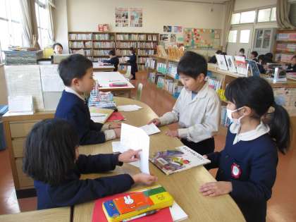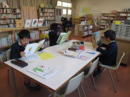 毎週火曜日は、1年1組・2組、2年1組・2組、3年1組が図書館を利用しています。本の貸し出しをしたり読み聞かせをきいたり、大好きななぞなぞクイズや折り紙の本、童話に昔話、人気のシリーズ本などを手に夢中に読書をしています。
