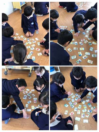 今日は「かるたあそび」と「だるま落とし」に挑戦!まずは、かるた。かるたをするのは初めてという子も何人かいました。ルールを確認して、いざ、勝負!今日の読み手は担任。担任の声に最大限に意識を集中する子どもたちでした。