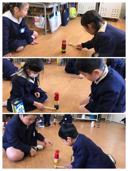 続いて、だるま落とし。だるま落としは先週から取り組んでいるとあって、だんだんコツを掴めてきた様子。「よしっ、全部いけた!」「あー、あと一個やったのに〜!」などなど、大盛り上がりでした♪
