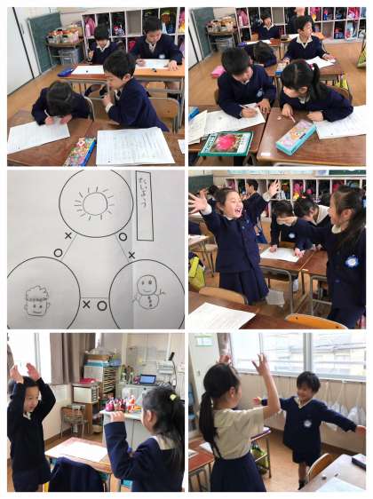 「じゃんけんやさんをひらこう」の学習。今日は自分だけのオリジナルじゃんけんを考えました。3つの力の関係と、その理由、それぞれのポーズを真剣に考える子どもたち!出来上がった後は、お隣さん同士で、もっと分かりやすくする方法はないかなどのアドバイス交換をしました。そして最後にはもちろん、完成したオリジナルじゃんけんで、じゃんけんあそび!個性あふれる楽しいじゃんけんがたくさん生まれました!