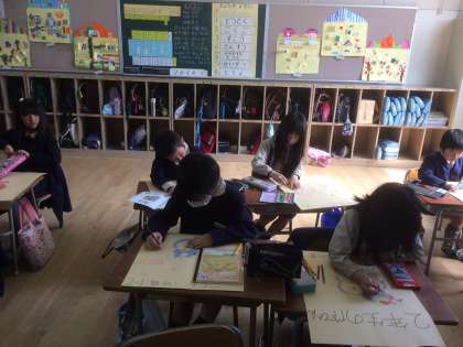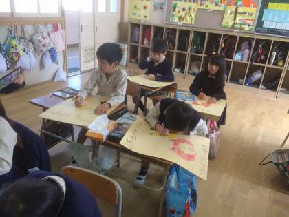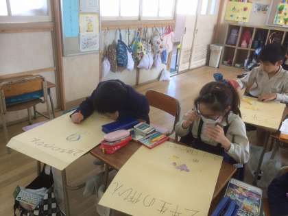 1年間の作品を整理して持ち帰るための作品袋に名前を書いたり、絵を描いたりしました。今週仕上げて、来週持ち帰る予定です。