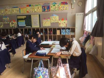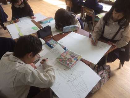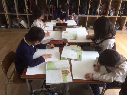 上手に絵を描いている友だちをほめている児童がいたり、こうした方が木らしくなるよと教えている児童もいました。