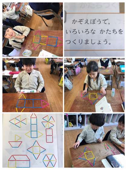 今日は「かたちづくり」の学習で、数え棒を使い、いろいろな形を作りました。教科書をよく見て、数え棒を慎重に配置していきます。一つ形を完成させるごとに「せっかくできたのに、崩すのもったいないー!」「ずっと置いときたいー!」と言いつつも、次々と形を作り上げていき、その出来栄えに満足顔の子どもたちでした♪