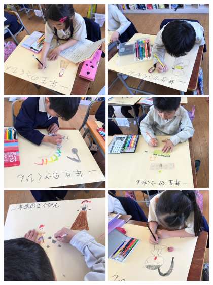 今日は、作品袋に梅香小学校での思い出の絵を描きました。作品袋は、一年間描きためた様々な絵画作品を入れて、お家に持ち帰るための袋です。「跳び箱が楽しかったから跳び箱かこう!」「ぼくは粘土遊びの絵にするー。」「鍵盤ハーモニカの絵にしようかなー。音符も描きたいなぁ」「けん玉遊びの絵も描こう!」「どんぐりゴマもいいな!」「ほんまや、わたしも描こう!」などなど、どんどん描きたい絵が次々と思い浮かんで、今日一日では仕上がりませんでした。また明日続きを描きます。来週の持ち帰りますので、お楽しみに♪