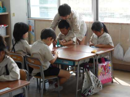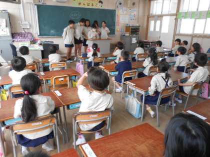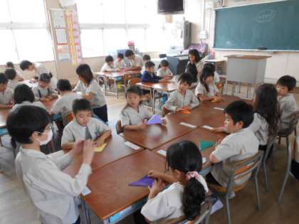 6年生が1〜5年生の各教室に行き、鶴の折り方を教えました。
