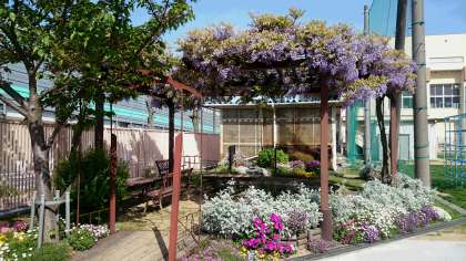 校庭の西側に藤棚や観察池のある自然園があります。