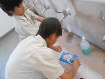 また、廊下に出ると、2年生がザリガニの水替えをしていました。ザリガニもとても気持ち良さそうでした♪