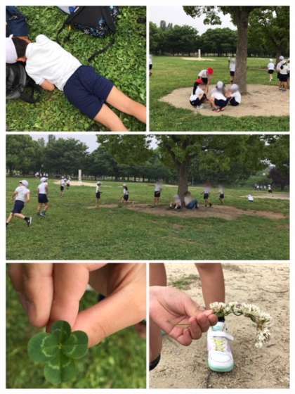 咲くやこの花館の見学を終え、大芝生にやってきました。今からしばらく自由タイム!鬼ごっこをしたり、芝生に寝っ転がったり、シロツメクサでブレスレットを作ったり・・・!みんな思い思いに楽しんでいます。なんと、四つ葉のクローバーを見つけた子もいましたよ♪