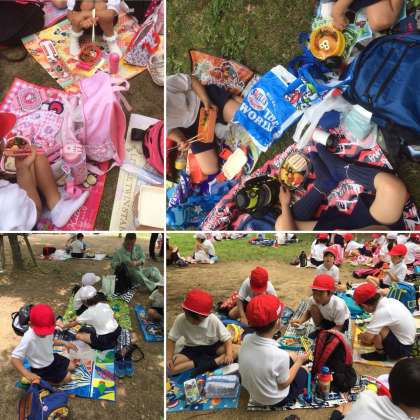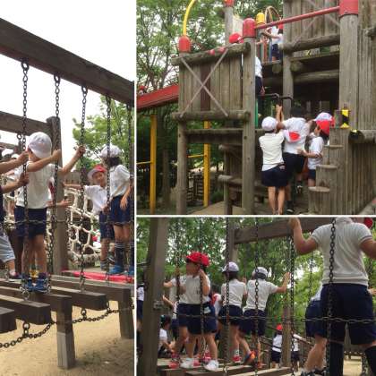 公園では、1.2年生でグループになって、遊具を回りました。暑くて汗をいっぱいかきまがら、遊びまわっていました。