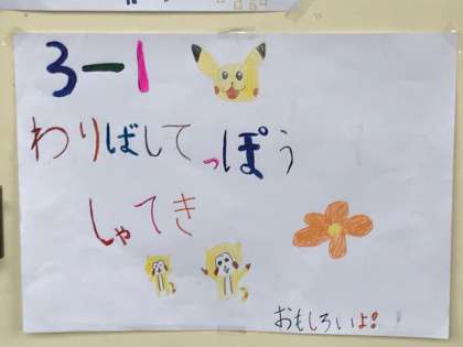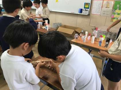 3年生のお店は、「割りばし鉄砲 射的」です。自分たちで作った割りばし鉄砲を使って、的を狙います。うまく当たるかな?
