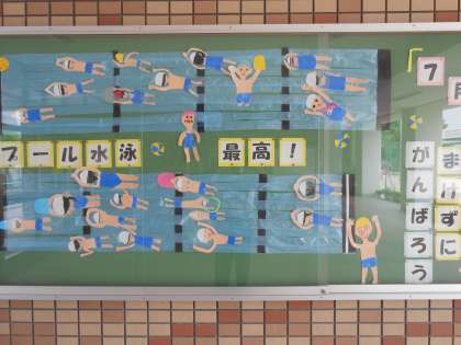 7月は5年担当です。玄関掲示はプール水泳です。子どもたちが考えて作りました。
