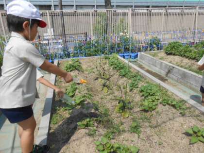 2年生の畑は、大豊作!ナス、サツマイモ、ミニトマト、インゲン豆・・・