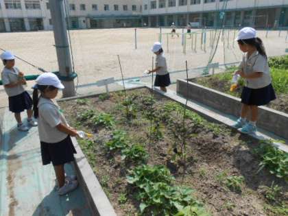 休み時間になると、子どもたちがペットボトルを手にして学習園に向かいます。