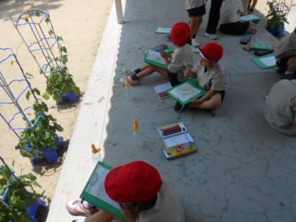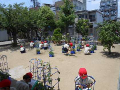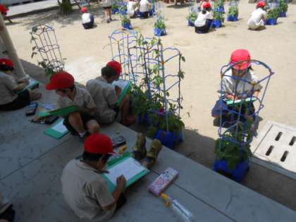 アサガオは毎日、勢いをつけて成長しています。大きな花をつけた鉢も多くなりました。