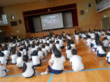 おはようございます!今日のたてわり班集会は、全校生徒で作った千羽鶴を6年生が広島に届けた様子をビデオで見ました!