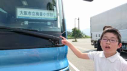 バスのフロントガラスに学校名の表示を見つけて大喜び♪