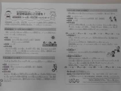 夏型感染症とO157について予防啓発のお手紙を配付させていただきました。夏型感染症についてはプール水泳の授業がはじまっていますので、ご家庭でもお子様の様子をよく看ていただくようお願いします。