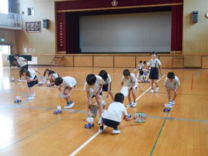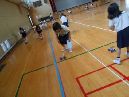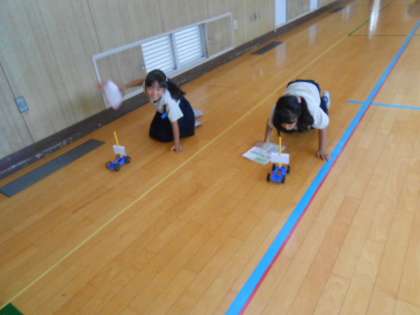 出来上がった車を、講堂に持って行って動かしました!