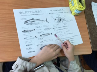 今日は、高見小学校の栄養教諭の先生に来ていただき、「さかなと友達になろう」というテーマで授業をしていただきました。