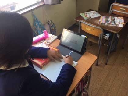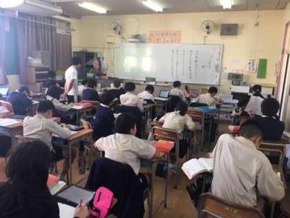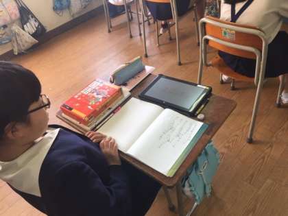 5つの例の同じ読みの漢字を見て、問題の漢字を予想します。例は前にも写しますが、手元のタブレット端末にも送られています。前後の文脈で考えたり、漢字辞典で調べたりして正解を探します。