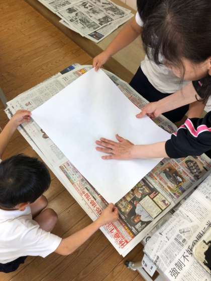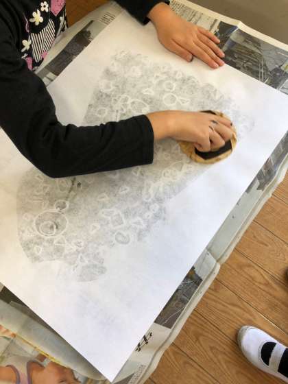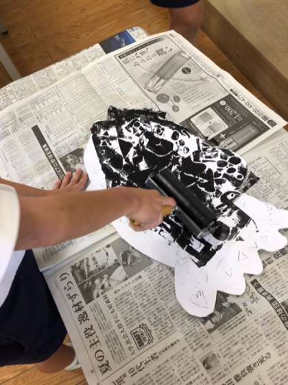 ローラーにインクを付けて、紙版のうえをコロコロ。あっという間に真っ黒。和紙をのせて、バレンでくるくる。和紙をめくって作品を見たときの子どもたちの顔は、どの子も素敵でした。みんな紙版を一生懸命作ったからだと思います。