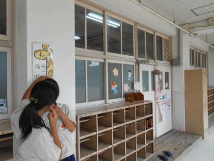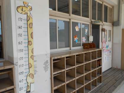 背がのびた〜!背がちぢんだー!保健室前にあるキリンの身長計は、いつもだれかが背をはかりにきています。