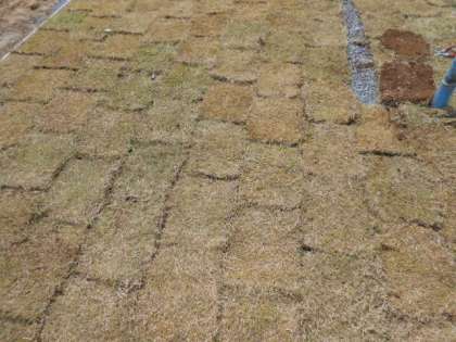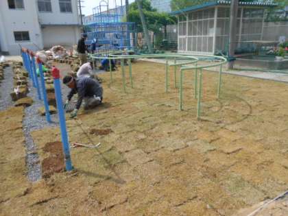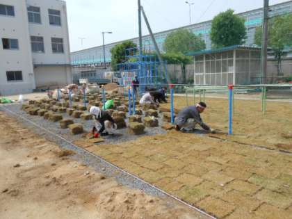 25日の芝生植栽会までの間に、広い面積の何割かを芝生を敷き詰めています。当日はセレモニーの後、皆さんに芝生を植えていただく予定です。