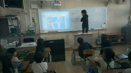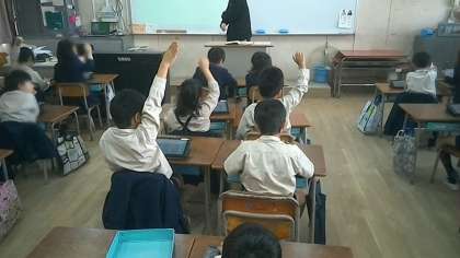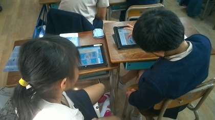算数の授業では、タブレット機器を用いて三角形や四角形についての学習をしています。今日の授業では、いろいろな形の図形をふたつの仲間に分ける活動を行いました。
