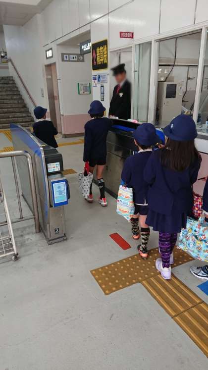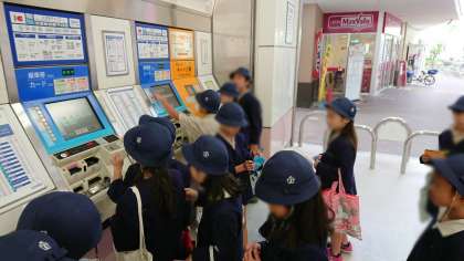 グループに分かれて自分たちで切符を買って電車に乗ります。画面から、上手にボタンを押して買うことができましたよ。