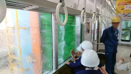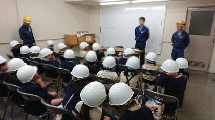 尼崎駅から少し歩くと尼崎車庫に着きました。まずは見学の際の説明を受けます。工場内では、安全のためにヘルメットを着用します。