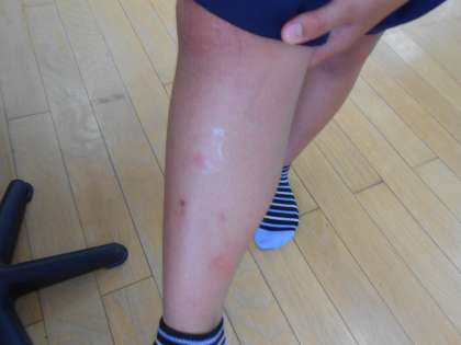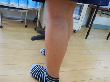 7月号のほけんだよりでもお知らせいたしましたが、虫さされで保健室に来る子どもが増えています。かきむしり、血が出ている子どももいて、写真の子どもは両脚に20か所以上刺されていました。かきむしってとびひなどにならないように、虫よけスプレーをふるなどの対策をとるようお願いいたします。