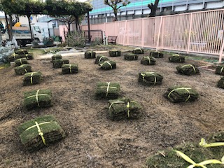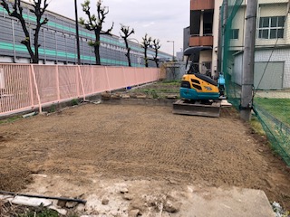 校地の西側、飼育小屋を撤去した部分の芝生化作業をしています。