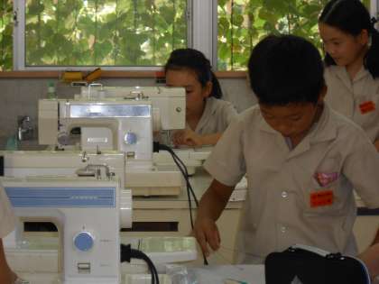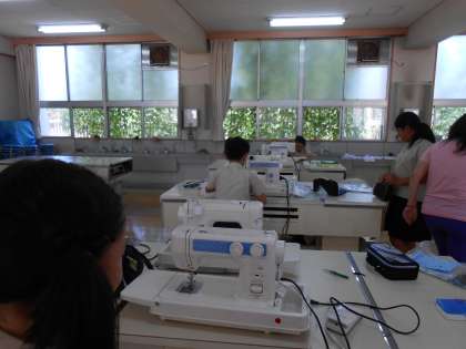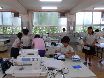 何やら、家庭科室から楽しそうな声が聞こえてきます。のぞいてみると、5年生がミシンをかけています。家庭科の実習の続きのようです。もうすぐ夏休み、やり残したことがないように頑張ります。