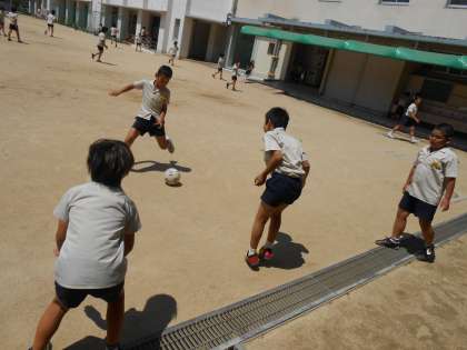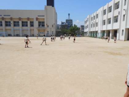 午前9時の時点で、大阪市は「暑さ指数」で「厳重警戒」15時には「危険」の予報がだされました。この写真は、昼休みです。運動場で遊ぶ子どもも少ない状況です。