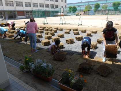 低学年・高学年に分かれて芝生を植えました。