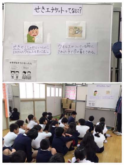 4時間目は発育測定でした。身長と体重を計る前に、咳エチケットについて学習しました。しっかりと咳エチケットを実践することが、さまざまなウィルスから身を守ることを知りました。発育測定の後は体育!2月2日のかけ足大会に向けて長距離走の練習です。寒さにも負けず元気よく走っていました!始業式からこの3日間、1人の欠席もない4年1組です。みんな、この調子で元気に過ごそうね!