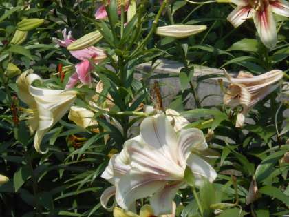 管理作業員さんが学校の周りを花いっぱいにしています。そこへ、都会では珍しいタテハチョウ(?)が飛んできました。写真中央のユリの花に留まっています。オレンジ色のきれいなチョウでした。