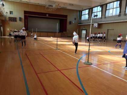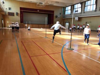 体育の授業で走り高跳びを練習しました。思い切って跳べるように、バーの代わりにゴムを跳び越えます。スタートから3歩で踏み切るように足を合わせるのが少し難しいようでしたが、何度も練習しているうちに、だんだんコツをつかんできたようです。