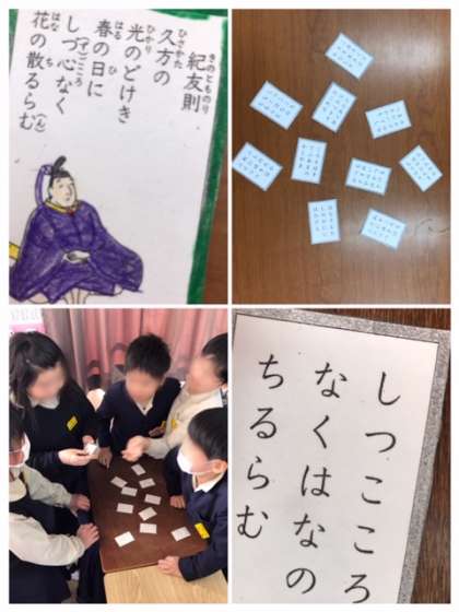 国語科で百人一首を学習してから、休み時間に百人一首をして遊ぶ姿が見られるようになりました。だんだん下の句を覚える子が増えてきて、札を取るスピードが上がってきました。札を取れたときは、とっても嬉しそうです!