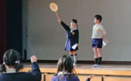 「Rock、Scissors、Paper」の掛け声に合わせ、4年生手作りの大きなグー・チョキ・パーのカードと対決!!