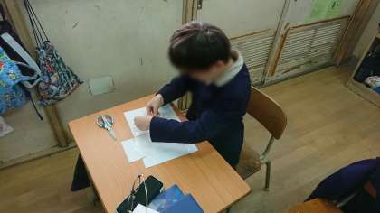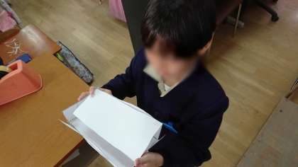 算数科では、はこの形について学習しています。家庭から持ってきた箱を画用紙に写して切り取り、面と面をテープで止めました。組み立てたときに箱の形になるように、面の形や大きさに気をつけながら、作ることができました。