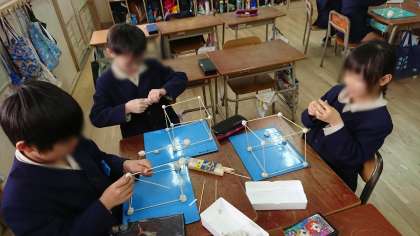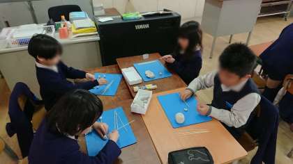 今日も引き続き、はこの形についての学習をしました。ひごを辺に、粘土玉を頂点に見立てて、はこの形を作りました。ひごの長さに気をつけて、うまく作ることができました。