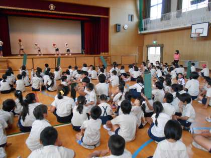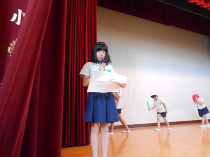 体育館は熱気なのか、暑さなのか、熱を帯びていました。集会委員会の子どもも先生に助けてもらいながらがんばりました。